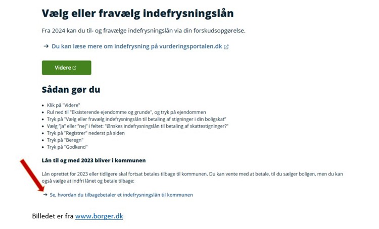 Lån oprettet for 2023 eller tidligere forbliver i kommunen og skal fortsat betales tilbage til kommunen. Beløbet for indefrosset grundskyld, kan du se på din årsopgørelse for 2024.